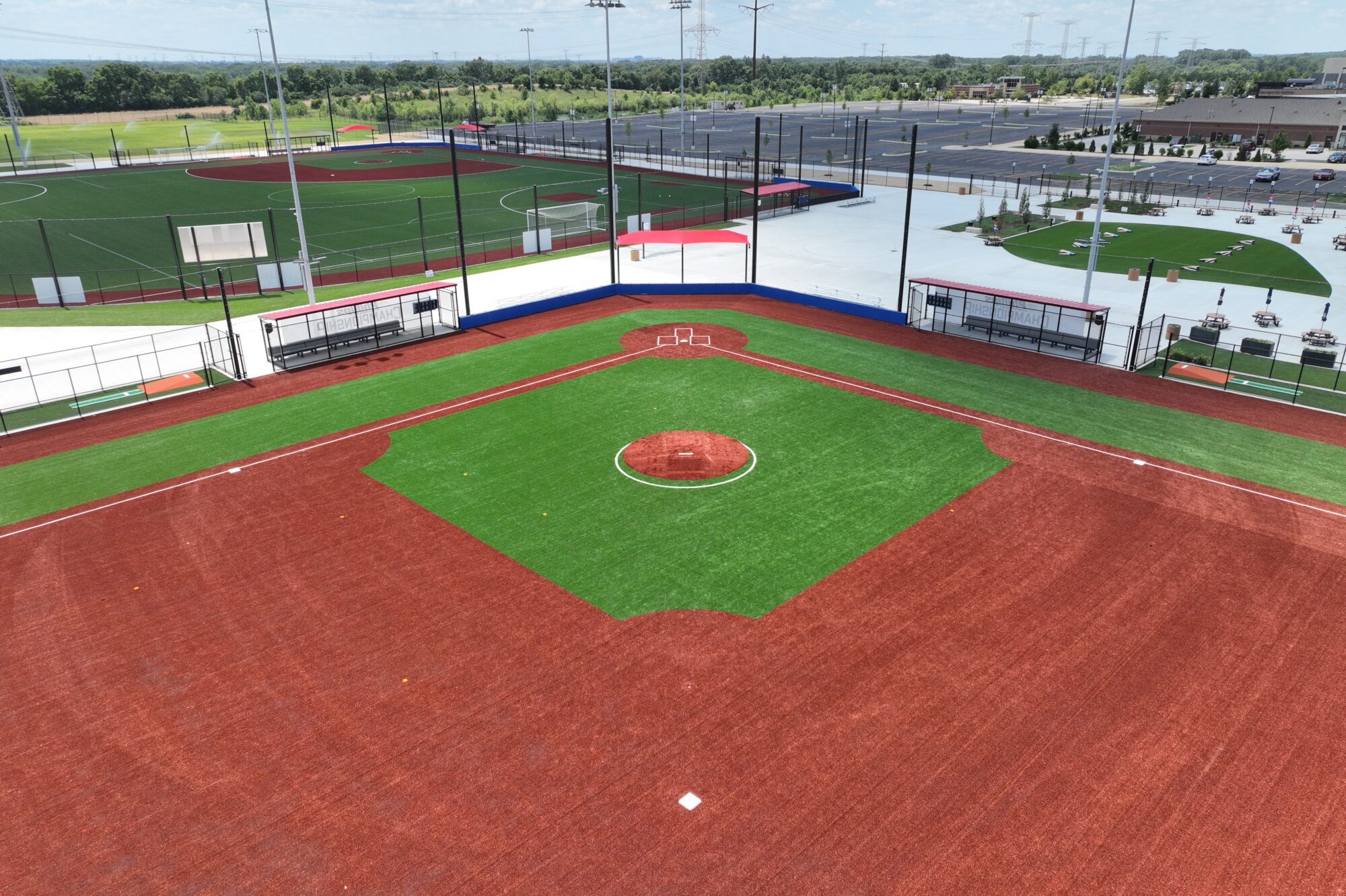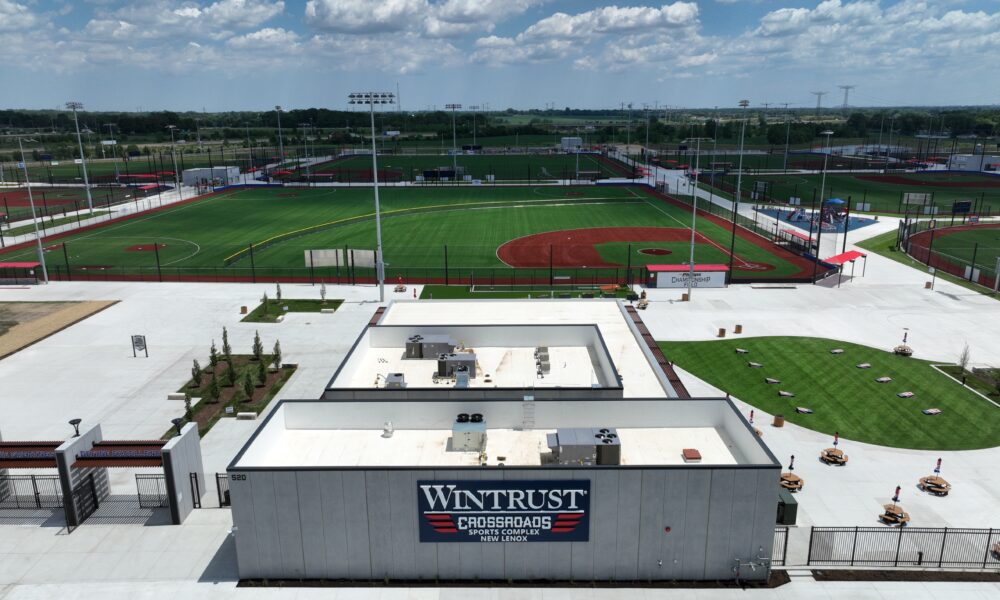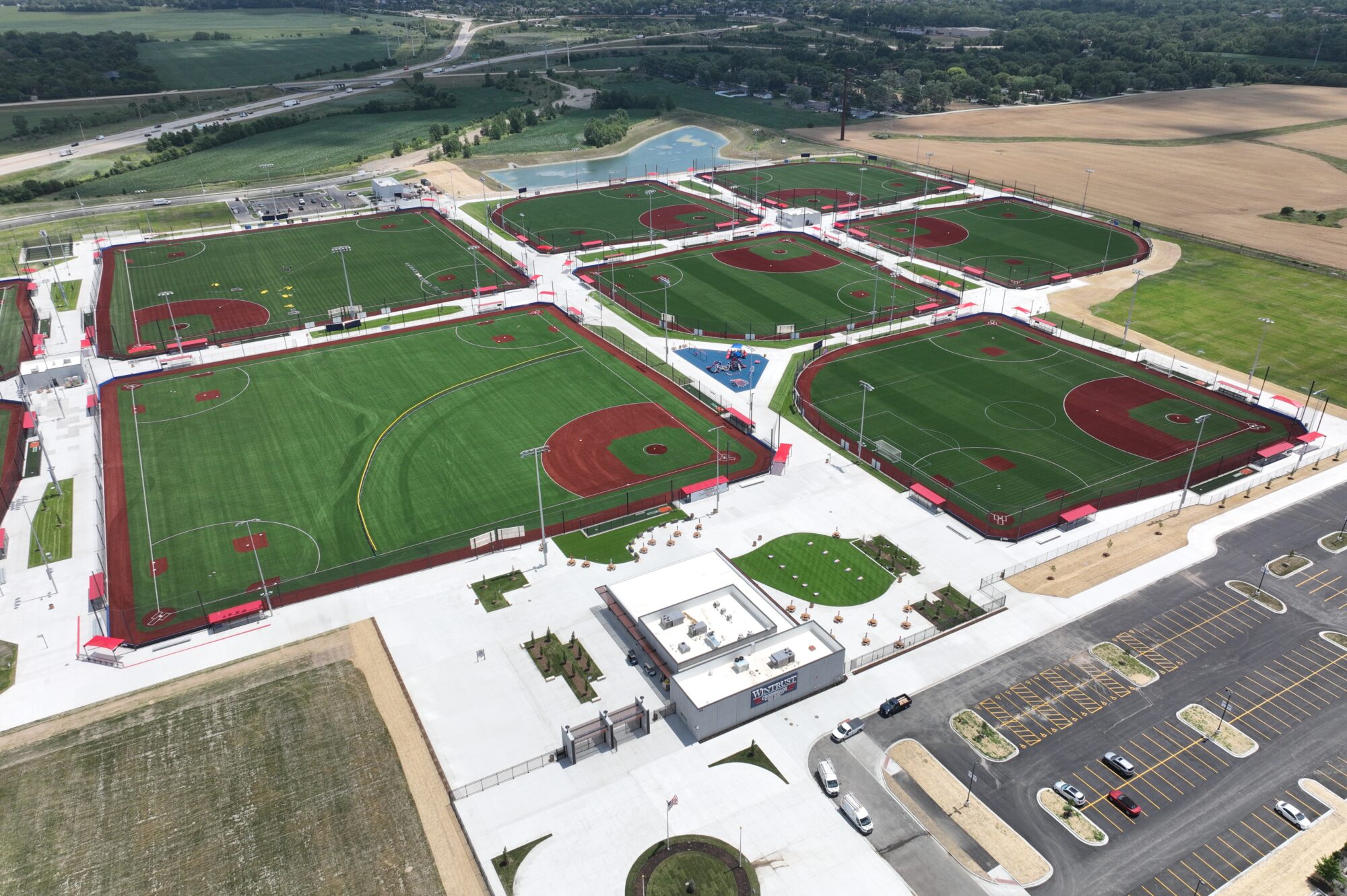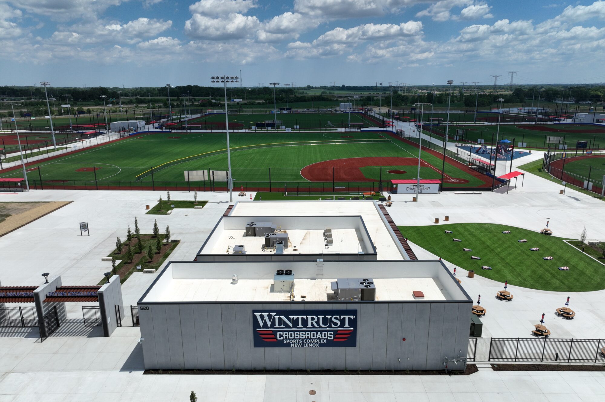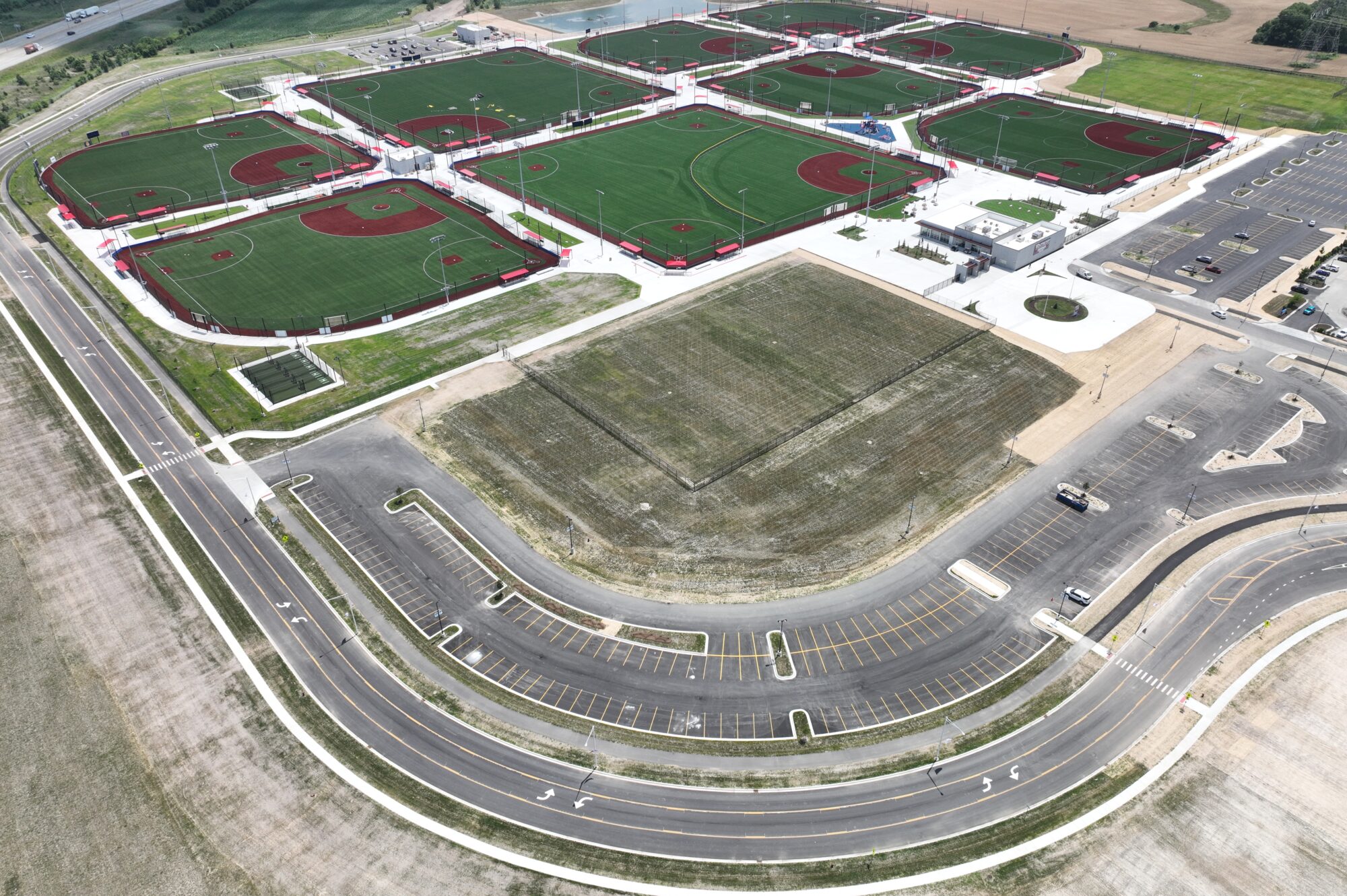 The New Lenox Crossroads Sports Complex spans 105 acres and offers a wide range of amenities for youth and adult recreation. The site features a welcome center, 22 youth baseball and softball fields, nine full-size fields, and 11 soccer or multi-use fields. Additional amenities include two full-service concession stands, a beer garden, a playground, and ten batting cages. The project also included a roadway extension and the construction of a roundabout to improve site access and traffic flow.